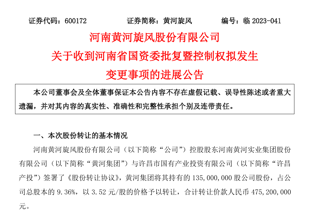 2023年,许昌产投通过股权转让的方式,成功收购了黄河旋风9.36%的股份。同时,作为一致行动人的许昌金控此前已持有上市公司6.81%的股份,合计持股比例达到16.18%,许昌市财政局正式成为黄河旋风的新任实际控制人。