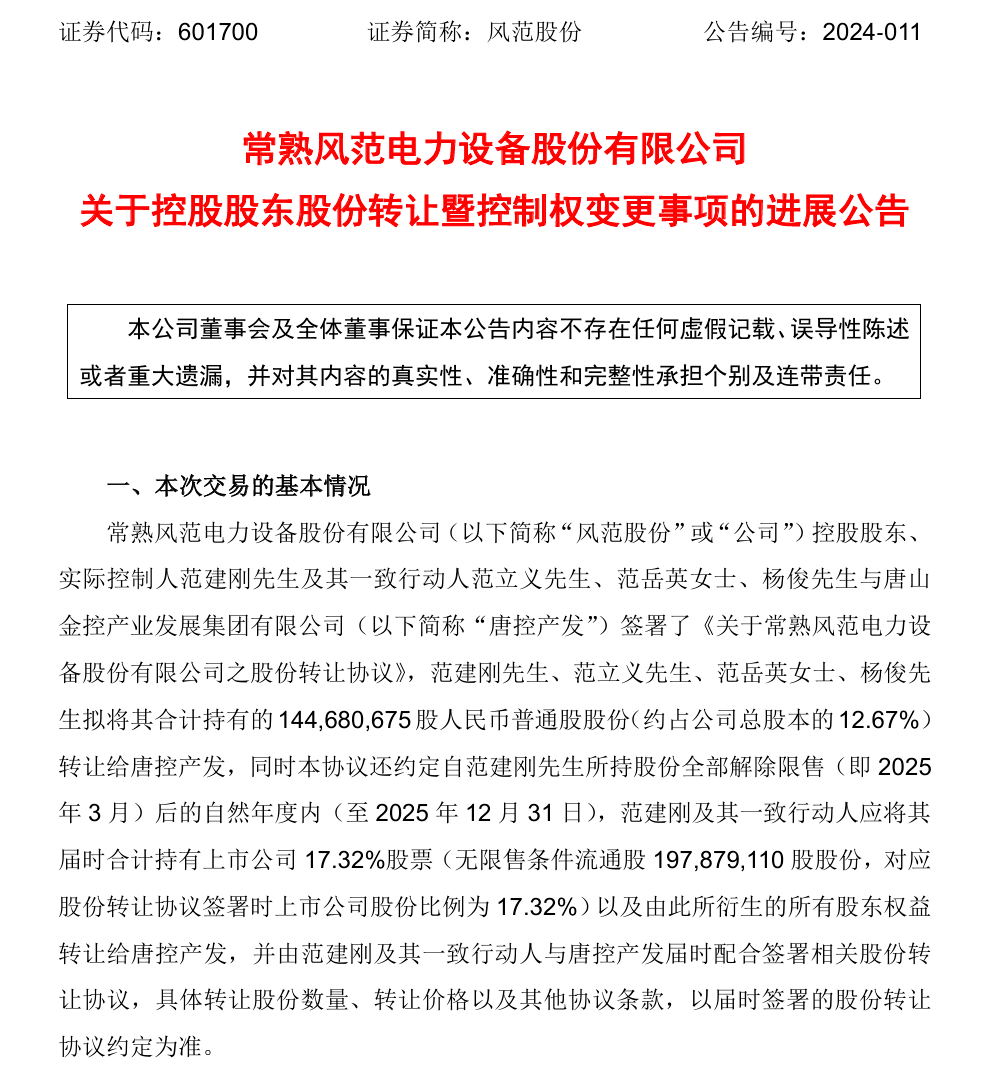 2023年,风范股份的原实际控制人范建刚及其一致行动人计划通过两次交易转让其在公司的控制权。首次交易中,他们以7.42亿元人民币的价格出售了公司12.67%的股份。在首次股份转让完成后,范建刚及其一致行动人放弃他们所持有的38%的表决权。