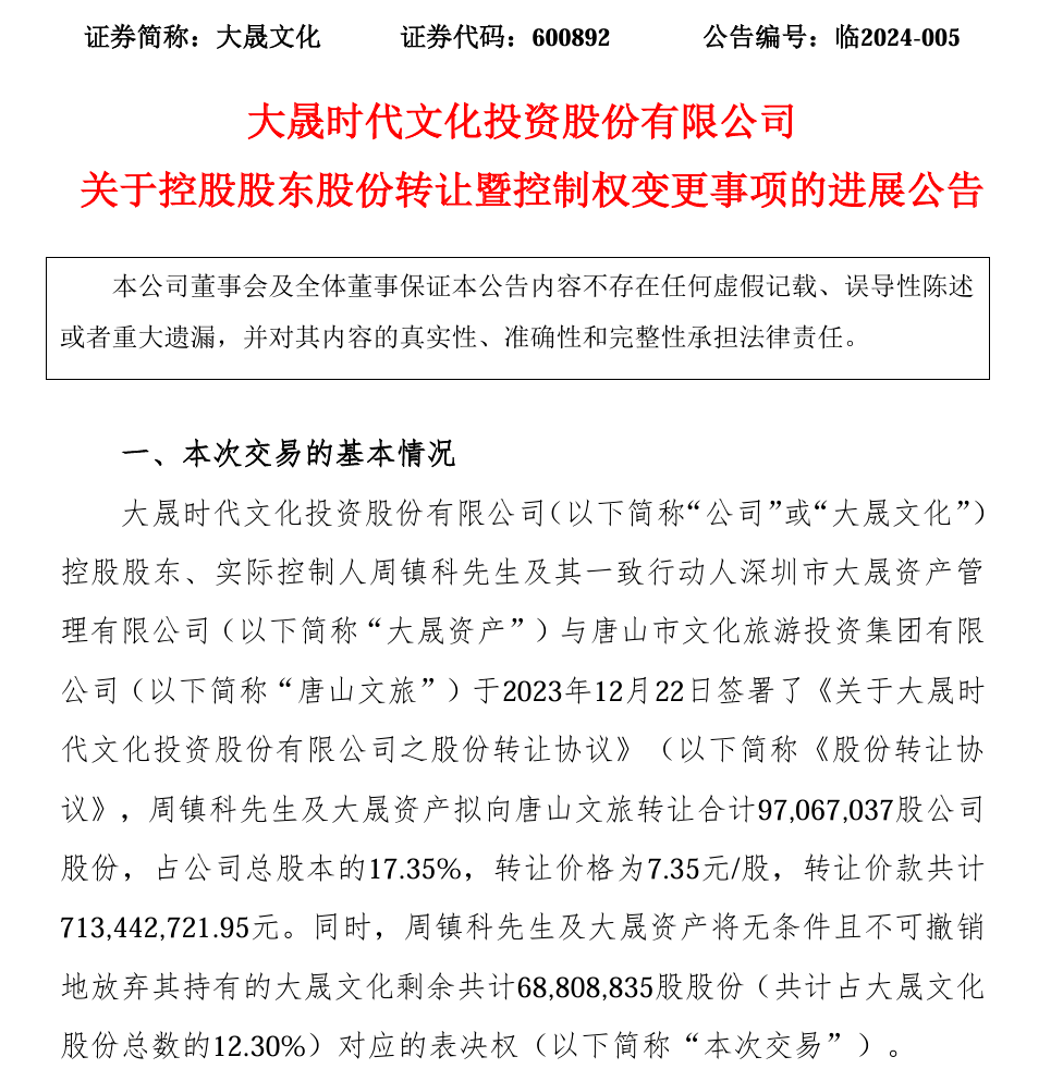 大晟文化原实际控制人周镇科及其一致行动人将17.35%的股份转让给了唐山文化旅游投资集团有限公司,同时放弃了对大晟文化12.30%股份的表决权,从而使得唐山国资成为大晟文化新的实际控制人。