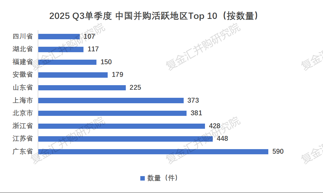 从各参与方所属地区分布来看,2025年7月-9月,中国并购市场活跃的地区仍为一线城市。按并购数量统计,广东省以590件居首,江苏(448件)、浙江(428件)、北京(381件)、上海(373件)等经济活跃区域位列前五。