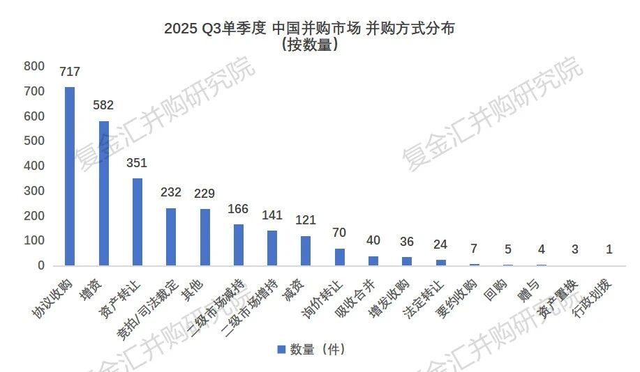 2025Q3单季度,按数量维度,协议收购以717件领跑,增资582件居次,资产转让351件列第三;竞拍/司法裁定等有一定发生量但远低于前三,资产置换、行政划拨等事件数量极少。