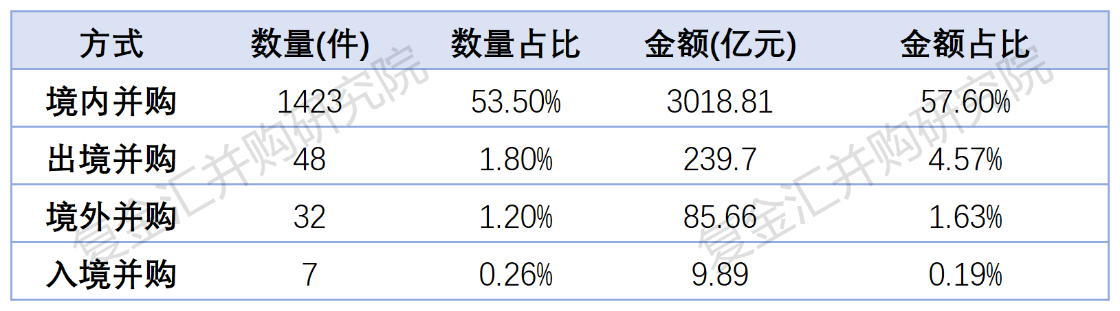 境内并购以1423件(数量占比53.5%)、3018.81亿元(金额占比57.60%),成为绝对主流,体现企业聚焦国内市场整合资源的倾向。