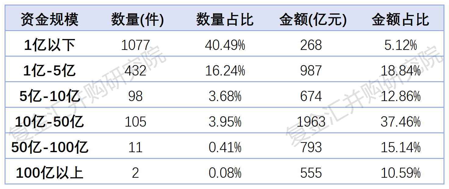 从并购资金规模分布看,1亿以下并购数量达1077件,占比40.49%,金额268亿元、占比5.12%,反映企业轻量整合、试水创新的需求。