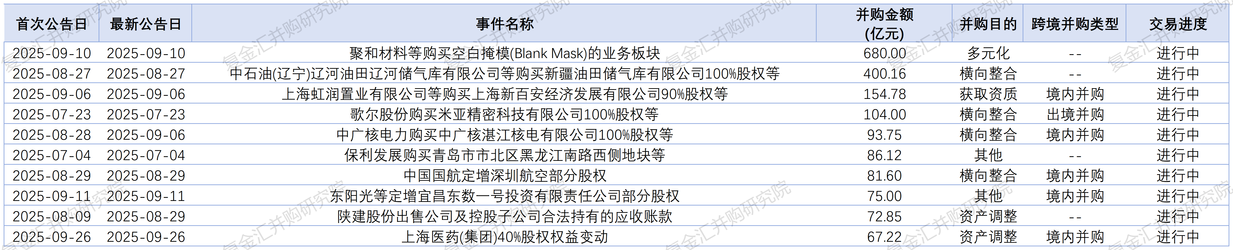 2025年Q3单季度的境内并购交易规模 Top 10事件,涵盖能源、制造等领域,聚和材料等购买空白掩模(Blank Mask)的业务板块以680亿元居首,歌尔股份购买米亚精密科技有限公司100%股权等、中广核电力购买中广核湛江核电有限公司100%股权等等金额可观,既反映能源行业资源整合需求,也有制造业资产优化动作。