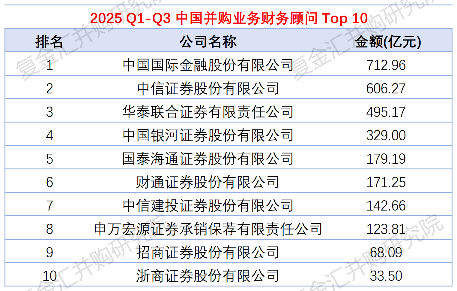 2025年Q1-Q3的律师事务所排名中,北京国枫律师事务所居首,交易金额达623亿元;北京市中伦律师事务所位列第二,金额为391亿元;北京市金杜律师事务所排名第三,交易金额262亿元。