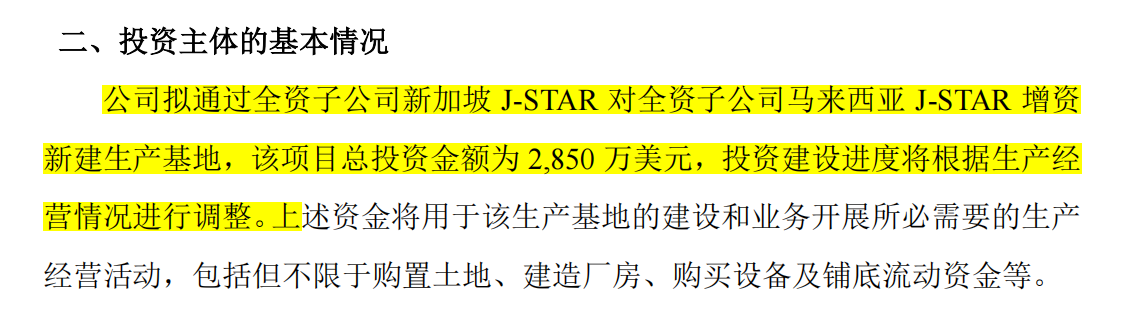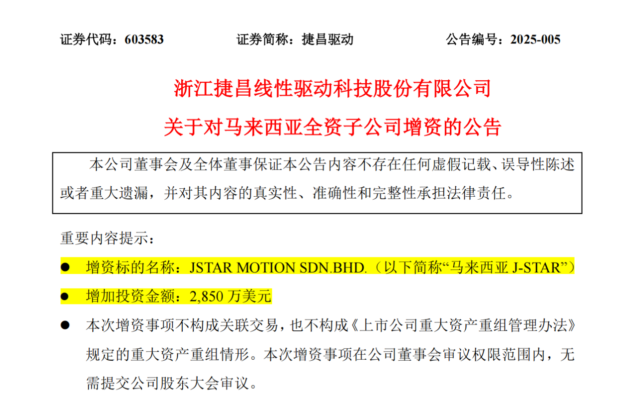 2025年3月,浙江捷昌线性驱动科技股份有限公司发布公告,宣布通过全资子公司新加坡J-STAR对马来西亚全资子公司JSTAR MOTION SDN.BHD.增资2850万美元,用于在马来西亚投资建设生产基地。