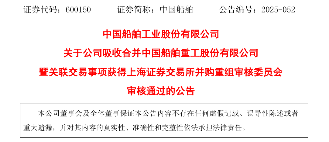 审核受理与通过:2025年5月8日晚,中国船舶公告称,上交所决定予以受理并依法进行审核其吸收合并中国重工事项。7月4日,上交所并购重组审核委员会召开会议审议,最终本次交易符合重组条件和信息披露要求,获得通过。后续尚需中国证监会予以注册以及相关法律法规所要求的其他可能涉及的必要批准、核准、备案或许可(如需)后方可正式实施。
