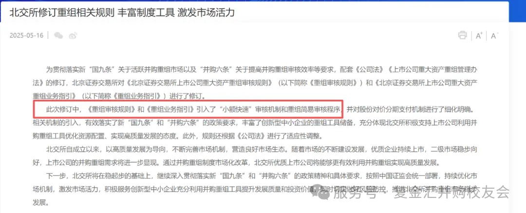 2025年5月,北交所修订重组相关规则,引入“小额快速”审核机制和重组简易审核程序,为创新型中小企业提供了更为灵活的重组工具。