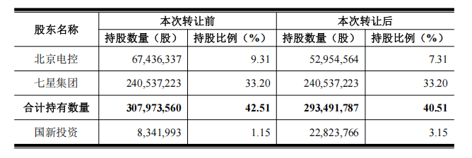 北京电控拟通过非公开协议转让方式,向国新投资转让其持有的公司1448.18万股无限售流通普通股,占公司总股本的2.00%。