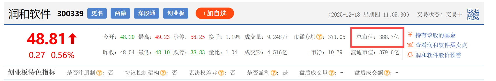 润和软件2025年12月18日市值(资料来源:东方财富网)