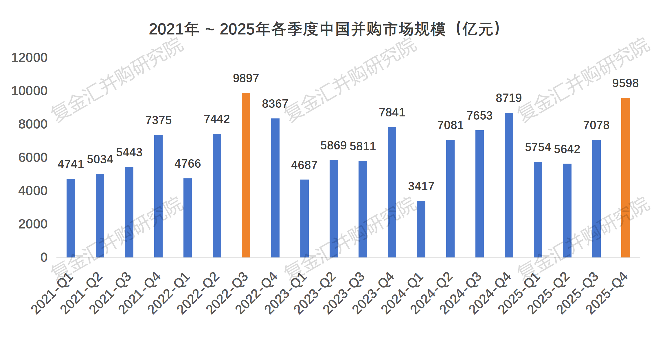 2025年四个季度的并购市场规模分别是5754亿,5462亿,7078亿和9598亿。