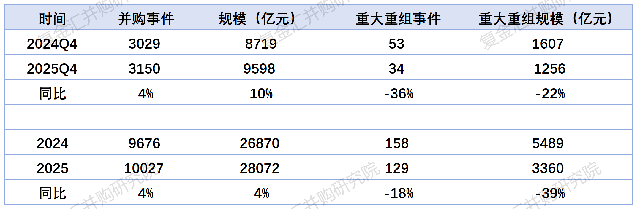 2025年四季度,并购事件3150件,同比增长4%;规模9598亿元,同比增长10%。重大重组方面,并购事件数量同比下降36%,规模同比下降22%。