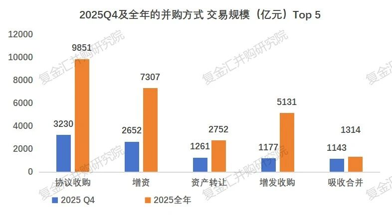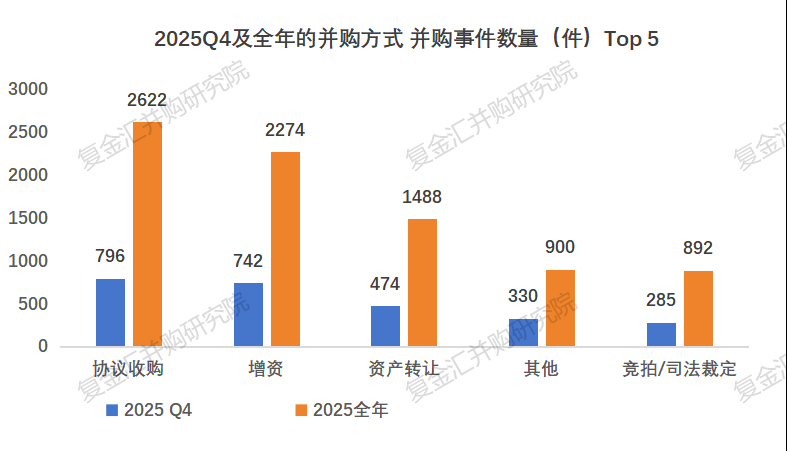 从数量角度看,无论是2025Q4单季度还是全年,协议收购、增资、资产转让都是市场主流操作方式,呈现当期并购市场行为偏好与运作格局。