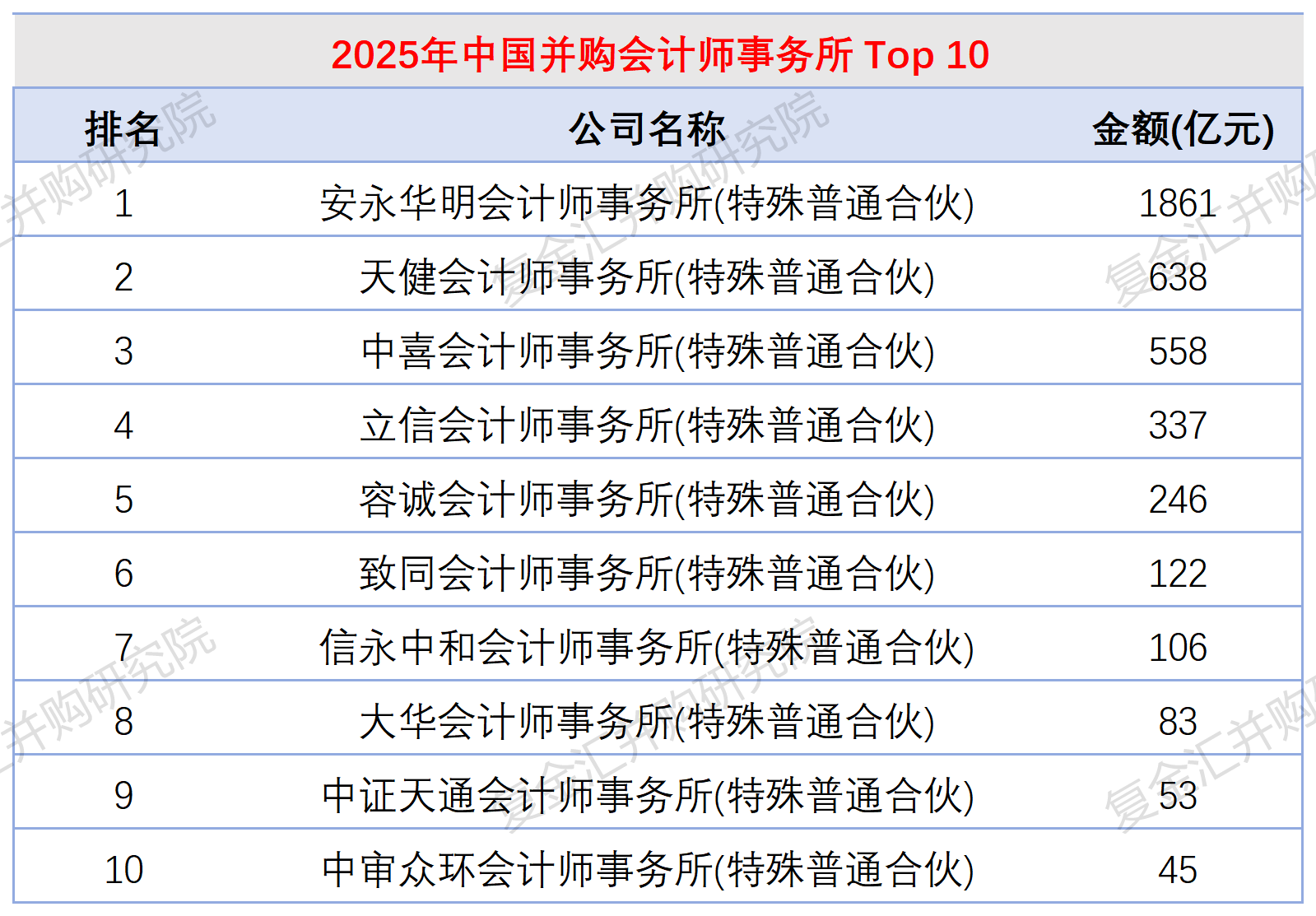 2025年按照并购交易规模,安永,天健和中喜会计师事务所分别是1861亿,638亿和558亿元,位居前三。