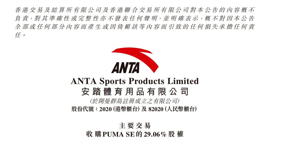 安踏将成为彪马的最大股东,但并未获得控股权。安踏在交易完成后拟寻求向彪马监事会委派合适的代表。