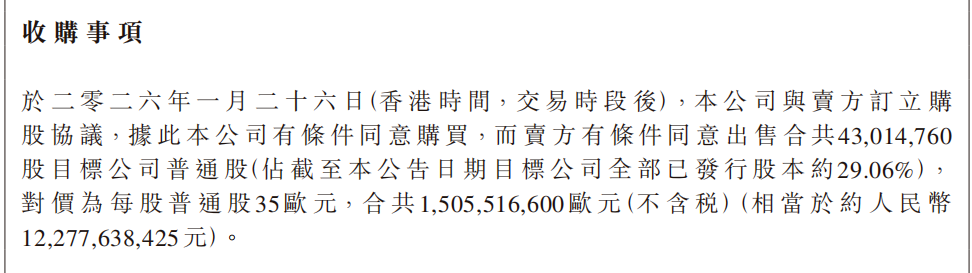 2026年1月27日,安踏体育发布公告称,已与皮诺家族旗下投资公司达成协议,以15亿欧元(约122亿人民币)现金收购彪马公司29.06%的股权。