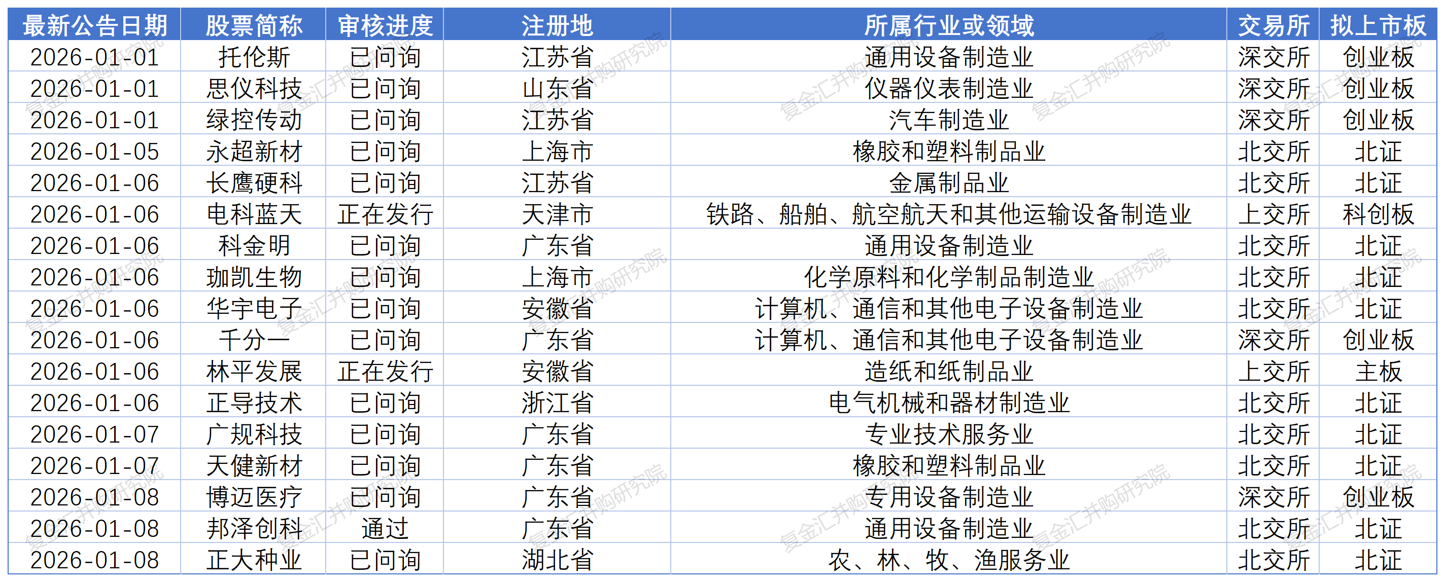 我们根据同花顺ifind数据库,对2026年1月的IPO申报进度,IPO审核未通过及通过未上市的企业进行梳理,旨在为并购交易买方提供优质的标的选择。
