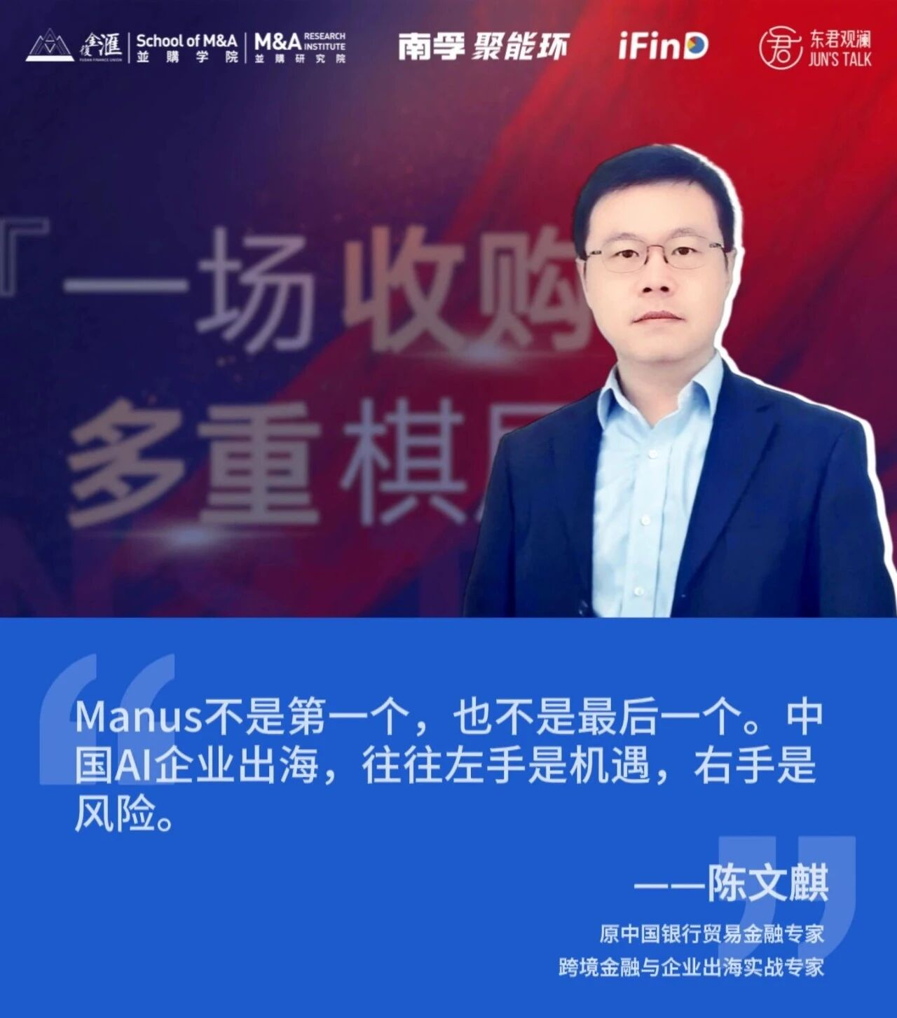 2026年1月21日晚,复金汇并购研究院院长宿东君于其个人账号【东君点金】开启《从 Manus 并购案看中美科技博弈》主题直播分享。本次直播特邀原中国银行贸易金融专家、跨境金融与企业出海实战专家陈文麒作为嘉宾与宿东君院长进行了一次深度对话。感谢南孚对此次直播的独家赞助,以及同花顺金融数据终端作为合作平台的鼎力支持!