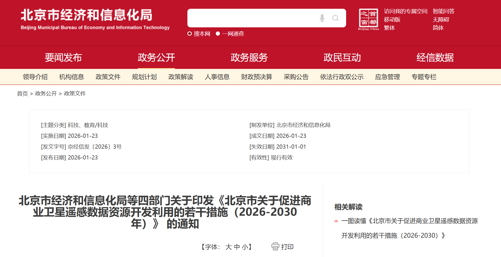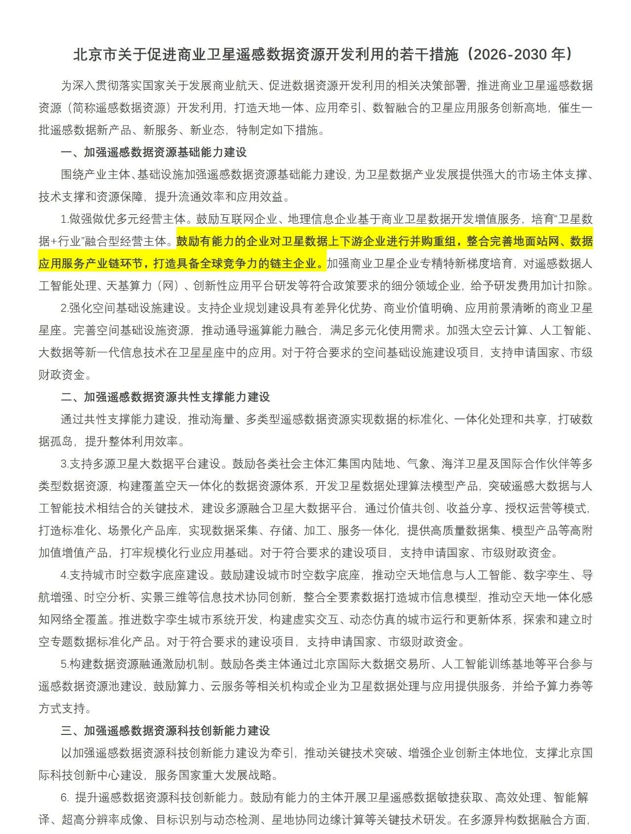 为加快形成商业卫星遥感数据产业新质生产力,构建现代化空天信息产业体系,北京市于2026年初出台了《北京市关于促进商业卫星遥感数据资源开发利用的若干措施(2026-2030年)》。