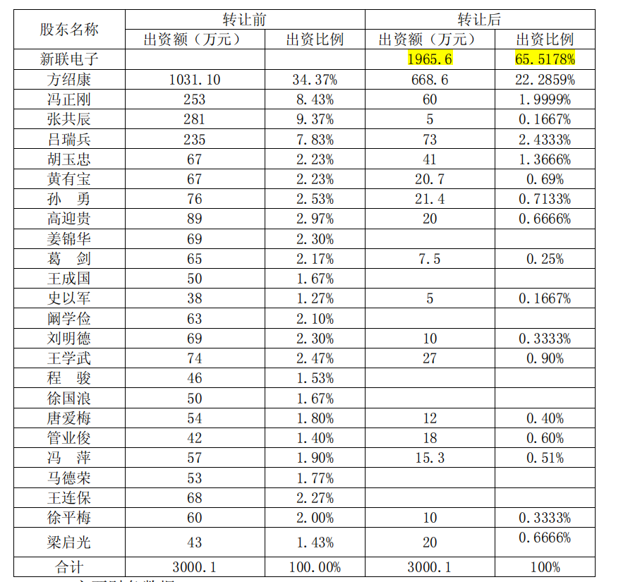 2014年10月,新联电子与江苏瑞特电子设备有限公司24名自然人股东签署了《股权转让协议书》。这24名股东以方绍康为首,共同持有瑞特电子的控股权。