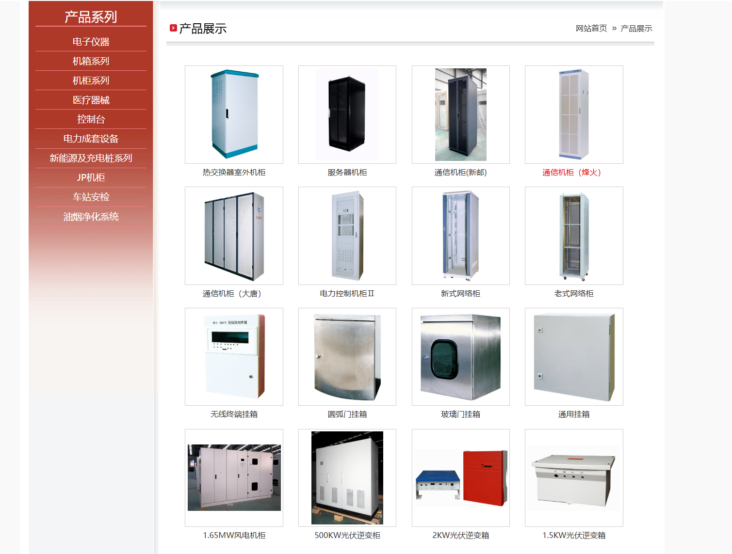 公司主要生产电力控制柜、内置空调户外柜、铝合金拼装柜、圆弧门网络柜、通信网络柜、高压环网柜、中置开关柜等几十种高档机柜、机箱及成套产品。
