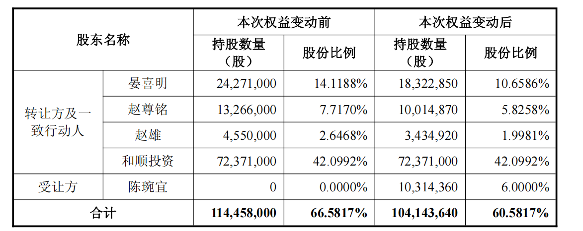 第二部分是和顺石油实际控制人及相关方向陈琬宜转让上市公司股份。公司实际控制人晏喜明、赵尊铭及其一致行动人赵雄,拟通过协议转让方式向陈琬宜合计转让公司6%的股份。