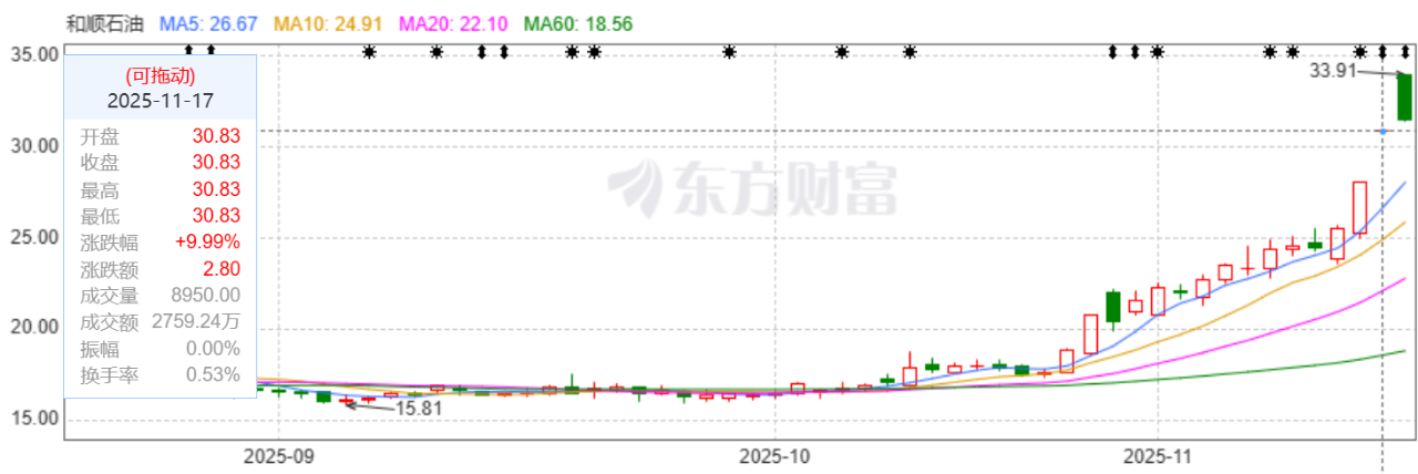 尽管这桩交易在11月16日晚间才正式公告,但资本市场的嗅觉显然更为灵敏。就在11月14日公告前,和顺石油股票开盘不久便封上涨停,显示有资金提前布局。
