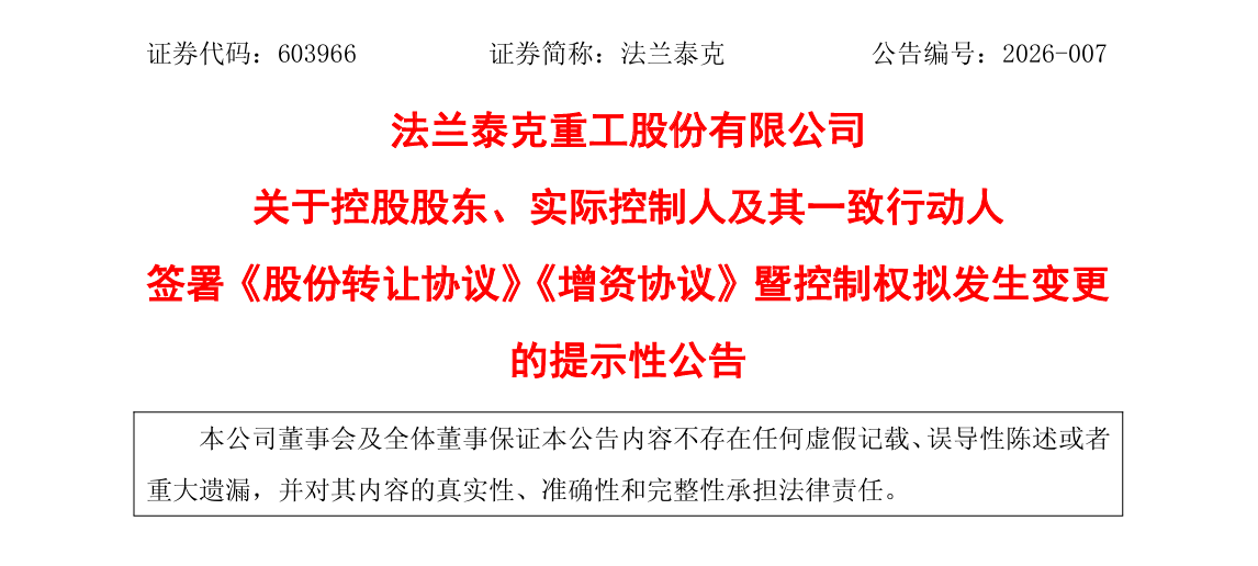 3月2日晚间,法兰泰克(603966)发布公告,公司控股股东、实际控制人金红萍、陶峰华夫妇与无锡新投启航并购投资合伙企业(简称“新投启航”)签署协议。前者通过转让股份及出让上海志享企业管理有限公司控股权的方式,合计让渡上市公司26.39%的表决权。交易总价款达11.41亿元,完成后,公司实际控制人将变更为无锡市新吴区人民政府。