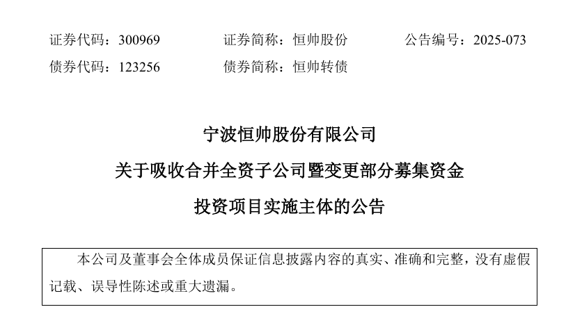2025年7月,恒帅股份决定通过整体吸收合并的方式,合并通宁电子的全部资产、负债和业务。合并完成后,通宁电子的独立法人资格将被注销,其所有权利和义务由恒帅股份承继。