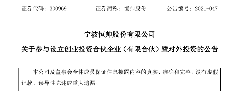2021年11月,恒帅股份宣布以自有资金1000万元参与设立宁波江北创业投资合伙企业。该基金总规模达4.72亿元,存续期为7年。