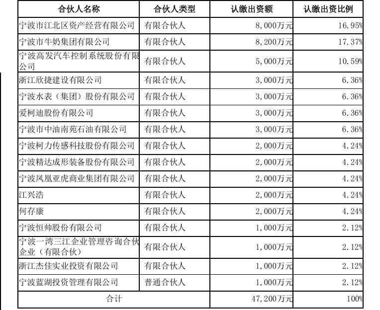 基金采用有限合伙形式,执行事务合伙人为宁波蓝湖投资管理有限公司。出资结构多元,其中国有资本(宁波市江北区资产经营有限公司)出资8000万元,占比16.95%,起到引导作用。