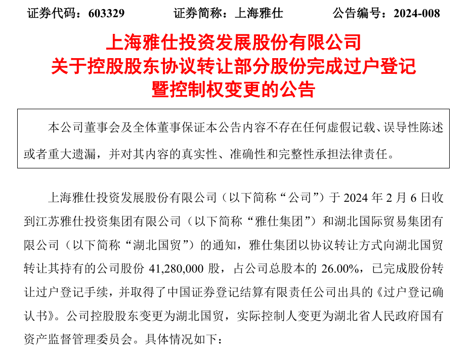 2024年7月,湖北国际贸易集团有限公司(隶属于湖北省国资委)通过股权转让的方式,成功收购了上海雅仕26%的股份,成为其控股股东。此外,上海雅仕计划向新的控股股东湖北国贸定向发行不超过3亿元的股票。