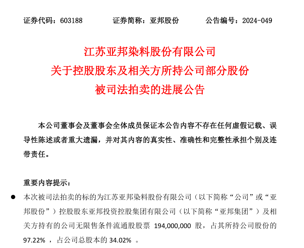 亚邦股份收到江苏省常州市中级人民法院送达的《执行裁定书》,解除对被执行人亚邦投资控股集团有限公司及其一致行动人许旭东合计持有的亚邦股份11890万股的冻结,并将上述股票交付申请执行人江苏国经控股集团有限公司。国经集团通过司法拍卖竞得公司总股本的8.79%,并因本次裁定执行股票增加至29.64%,成为公司控股股东。
