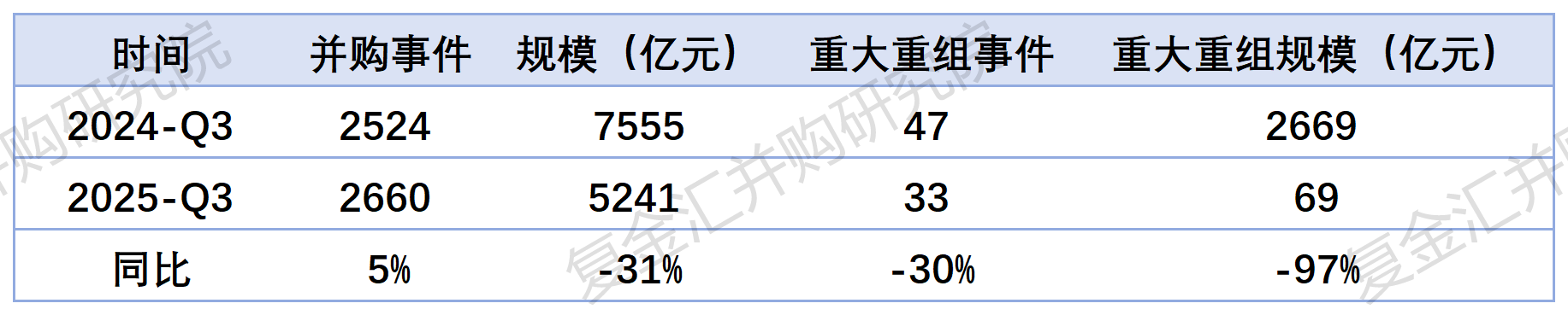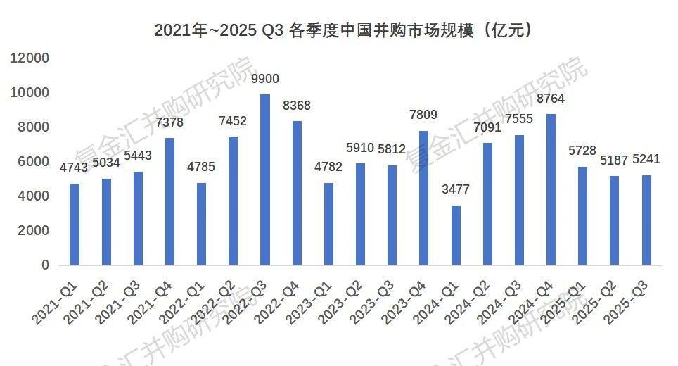 2025年三季度,中国并购市场共披露2660起并购事件,同比增长5%;交易规模约5241亿元,同比下降31%。