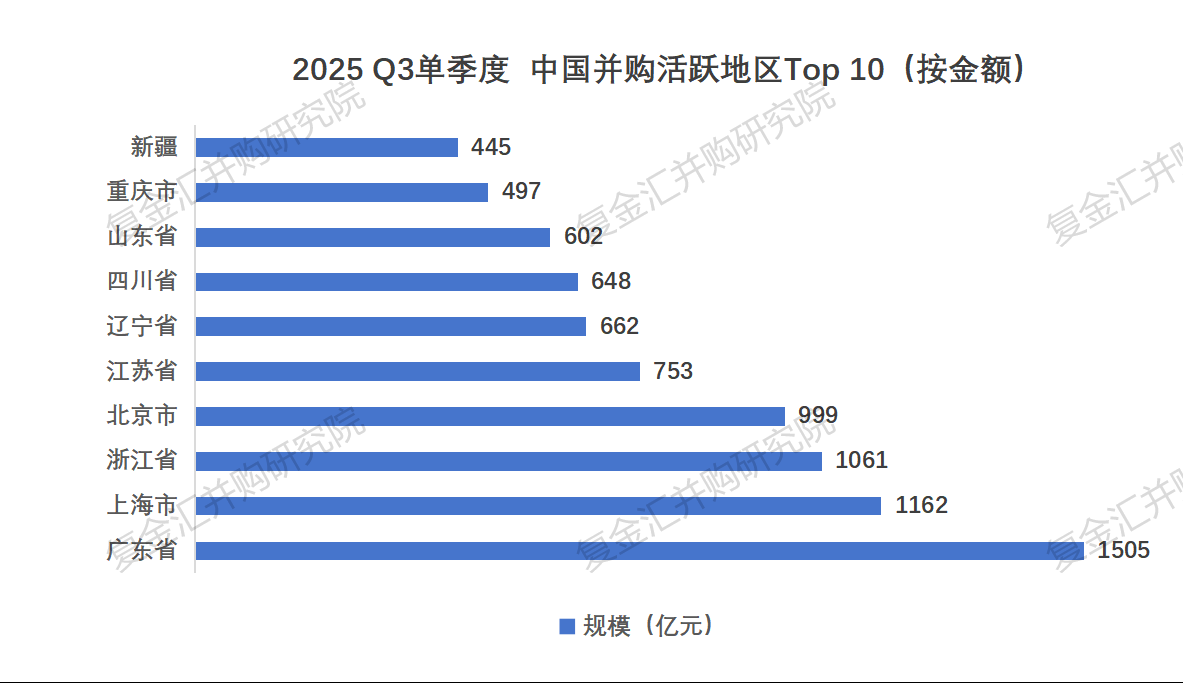 从各参与方所属地区分布来看,2025年7月-9月,中国并购市场活跃的地区仍为一线城市。按并购数量统计,广东省以590件居首,江苏(448件)、浙江(428件)、北京(381件)、上海(373件)等经济活跃区域位列前五。