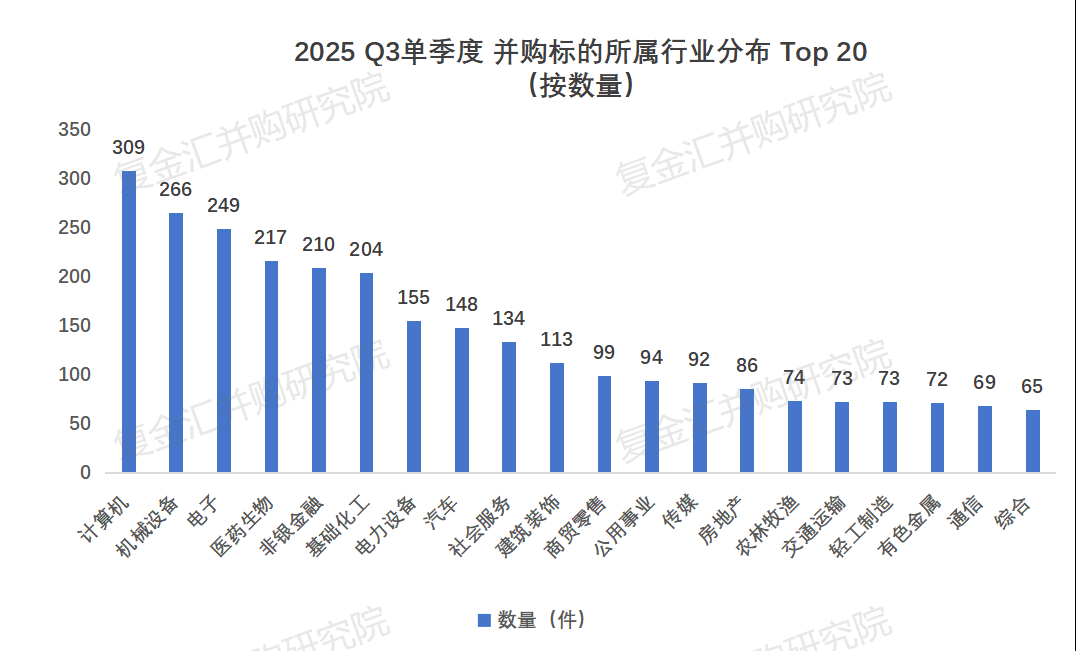 2025Q3单季度,按并购事件数量,计算机、机械设备、电子行业领跑,并购事件数分别达309起、266起、249起。医药生物(217起)、非银金融(210起)等行业也较活跃,反映科技制造、电子信息领域企业并购需求旺盛,通过频繁交易整合资源、拓展业务。