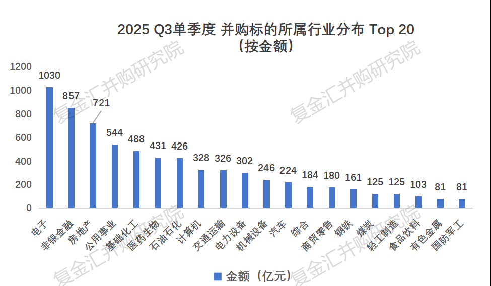 2025Q3单季度,按交易金额,电子(1030亿元)、非银金融(857亿元)、房地产(721亿元)是并购交易的重点行业。公用事业(544亿元)、基础化工(488亿元)等行业紧随其后。