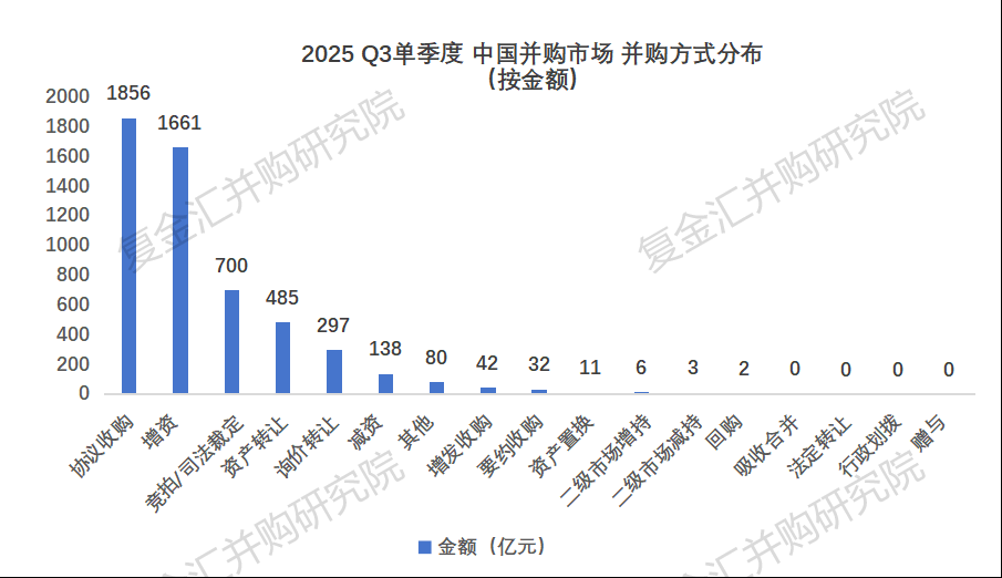 按金额维度,2025年Q3单季度的中国并购市场中,协议收购以1856亿元规模居首,增资1661亿元次之,竞拍/司法裁定700亿元列第三;资产转让、询价转让的金额相对靠前,分别为485亿元、297亿元;赠与、法定转让、行政划拨交易金额为0。