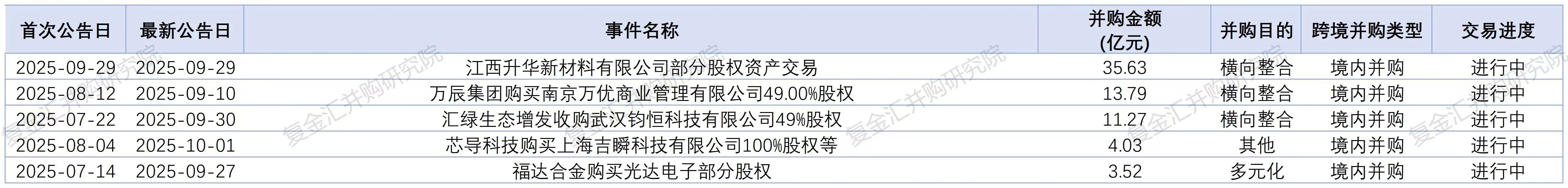 2025Q3单季度的重大重组事件方面,并购交易规模Top 5的事件分别为:江西升华新材料有限公司部分股权资产交易、万辰集团购买南京万优商业管理有限公司49.00%股权、汇绿生态增发收购武汉钧恒科技有限公司49%股权、芯导科技购买上海吉瞬科技有限公司100%股权、福达合金购买光达电子部分股权。