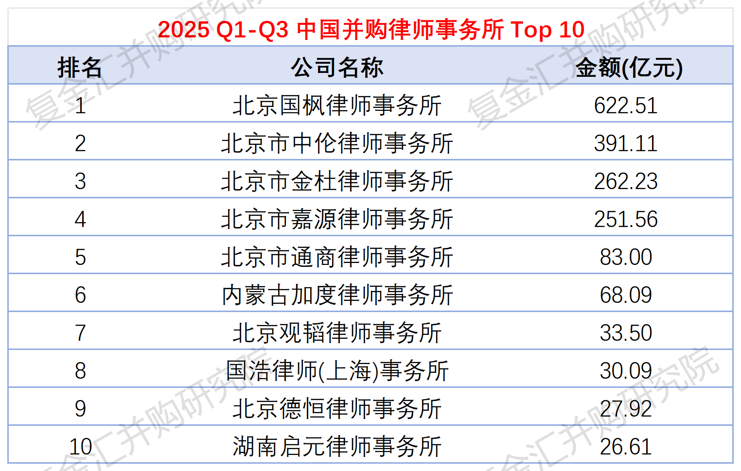 2025年Q1-Q3的律师事务所排名中,北京国枫律师事务所居首,交易金额达623亿元;北京市中伦律师事务所位列第二,金额为391亿元;北京市金杜律师事务所排名第三,交易金额262亿元。