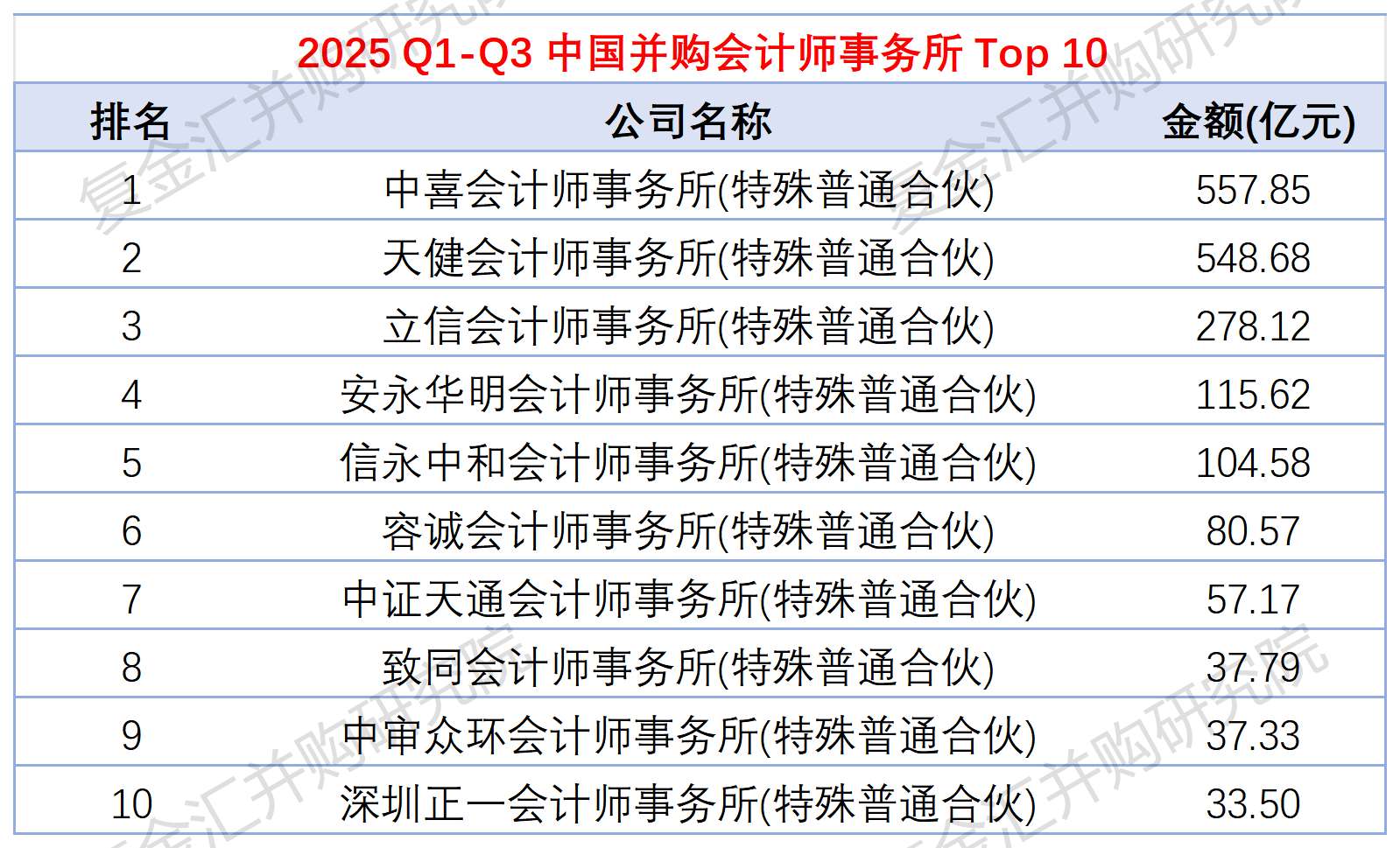 2025年Q1-Q3的会计师事务所排名中,中喜会计师事务所位居第一,交易金额达558亿元;天健会计师事务所(特殊普通合伙)排名第二,金额为548亿元;立信会计师事务所位列第三,交易金额278亿元。