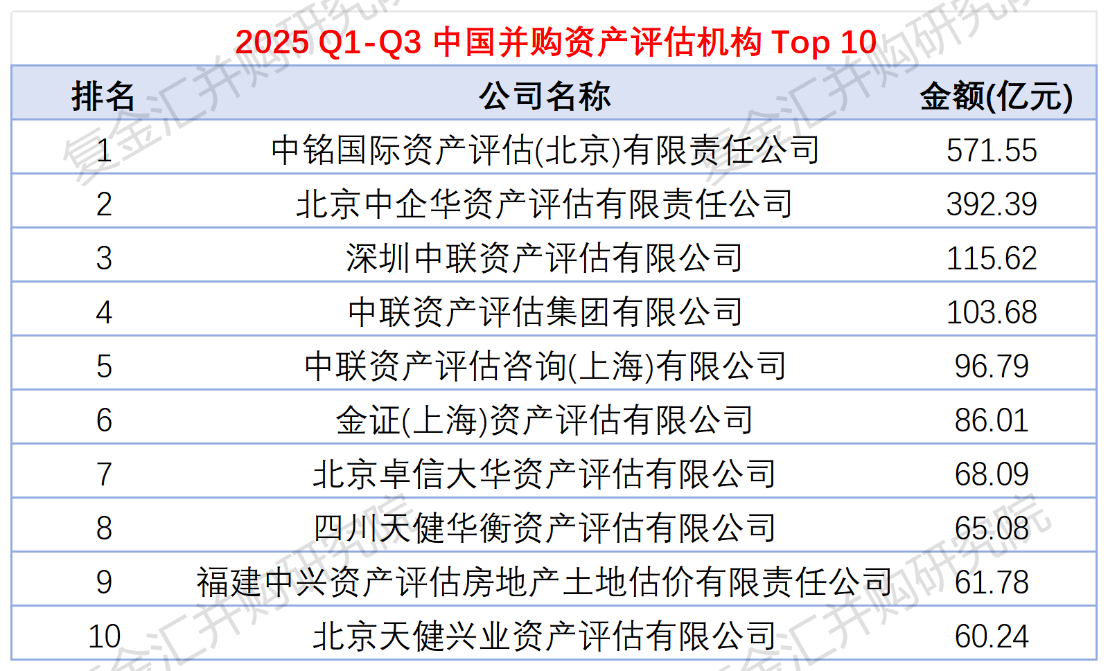 2025年Q1-Q3的会计师事务所排名中,排名第一的为中铭国际资产评估(北京)有限责任公司,交易金额达572亿元;排名第二的是北京中企华资产评估有限责任公司,交易金额393亿元;排名第三的是中联资产评估集团有限公司,交易金额116亿元。