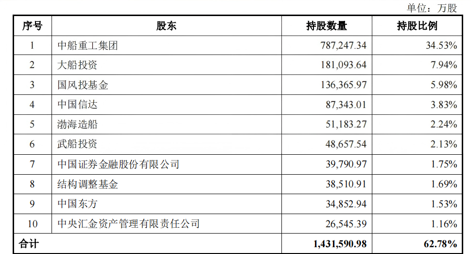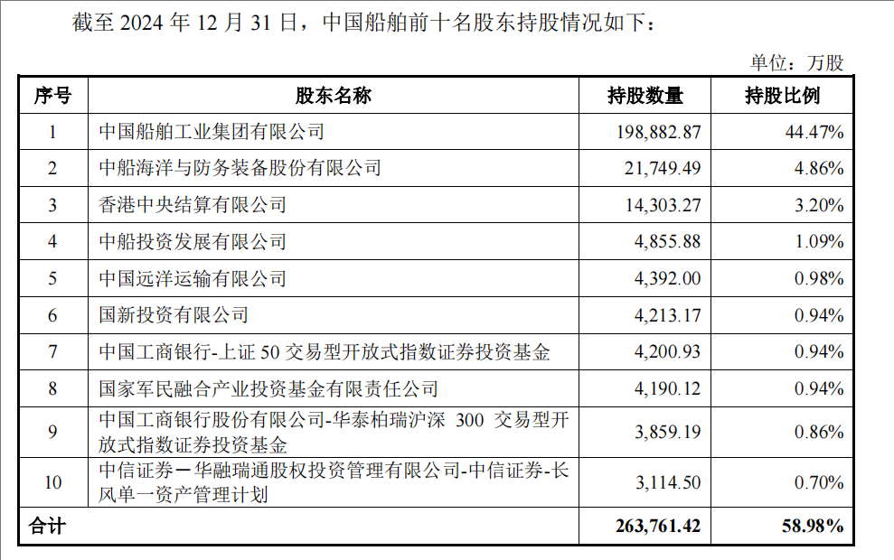 中国船舶前十大股东情况(截至2024年12月31日)与股权结构