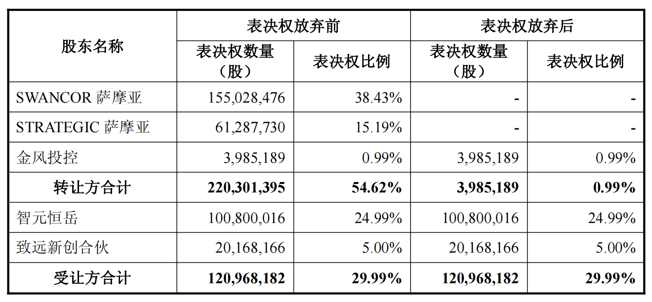 1. 协议转让:智元恒岳以协议转让的方式,受让上纬新材控股股东SWANCOR萨摩亚持有的1.01亿股股份,占公司总股本的24.99%。同时,致远新创合伙以协议转让的方式,受让SWANCOR萨摩亚持有的240.09万股股份和金风投控持有的1776.73万股股份,合计约占公司总股本的5%。合计持有29.99%的股份,接近要约收购义务30%的“红线”。