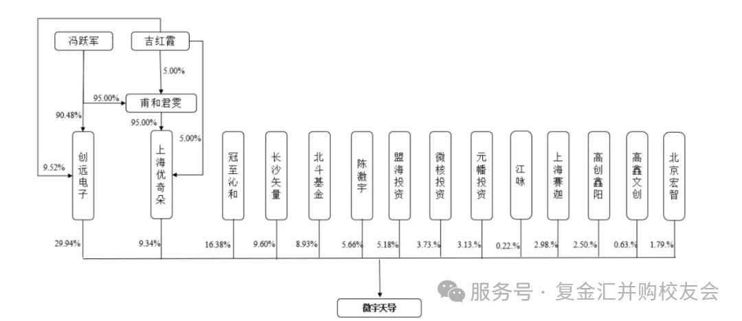 从微宇天导股权结构来看,创远电子与上海优奇朵均系冯跃军与吉红霞夫妇控制主体,二人亦为微宇天导的实际控制人,合计持股比例为39.28%。