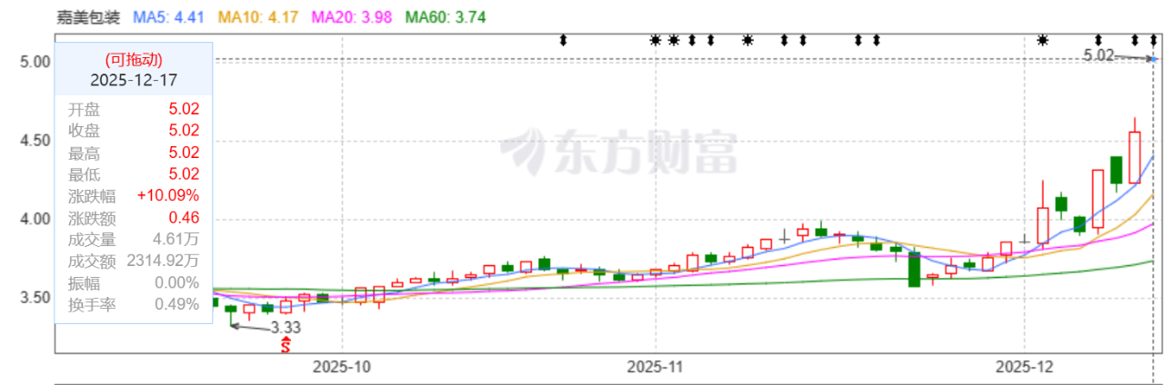 12月17日,市场用脚投票,嘉美包装股价一字涨停,报5.02元,市值约47.96亿元。这家老牌金属包装巨头正式迎来了一位科技掌门人。