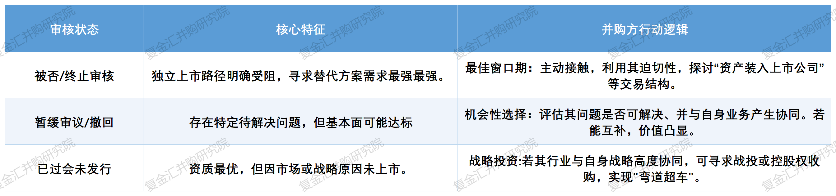 1. 被否 / 终止审核:这类企业独立上市的路径已明确受阻,因此寻求替代方案的需求最为迫切。对并购方而言,这是介入的最佳窗口期,应主动接触标的,利用其急于寻求出路的心态,探讨 “资产装入上市公司” 等交易结构。