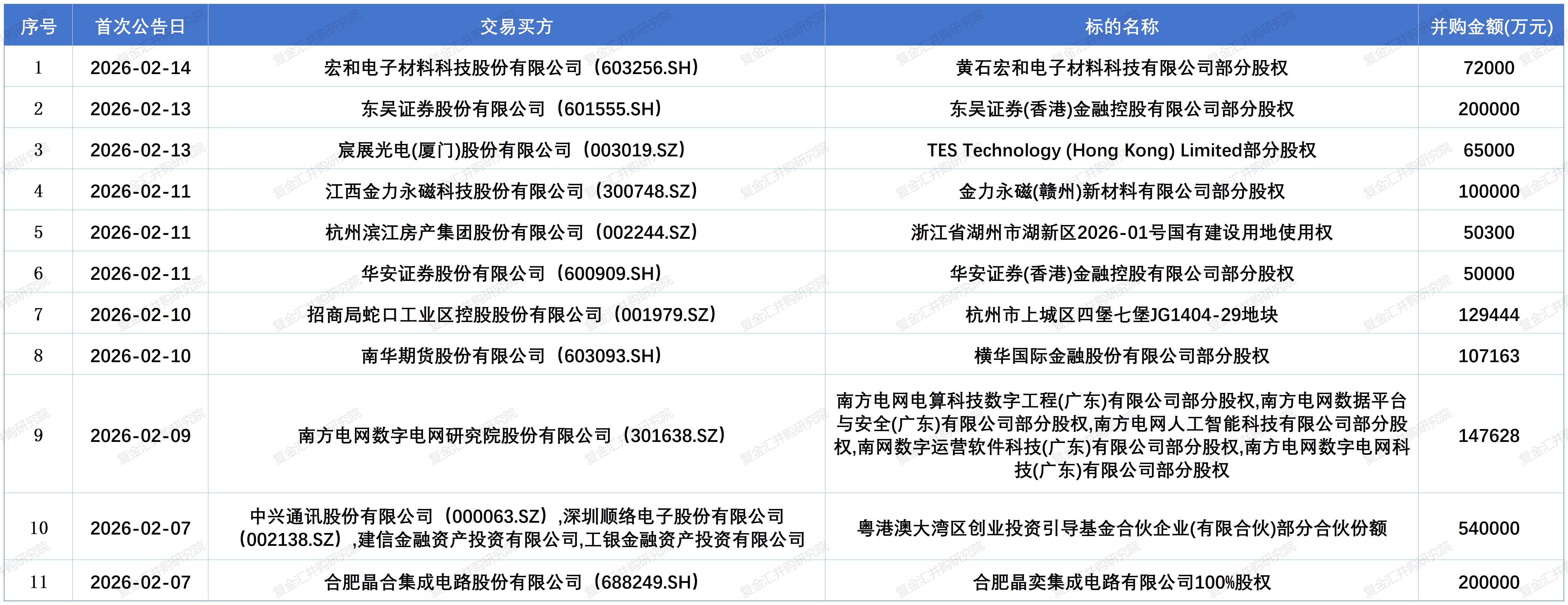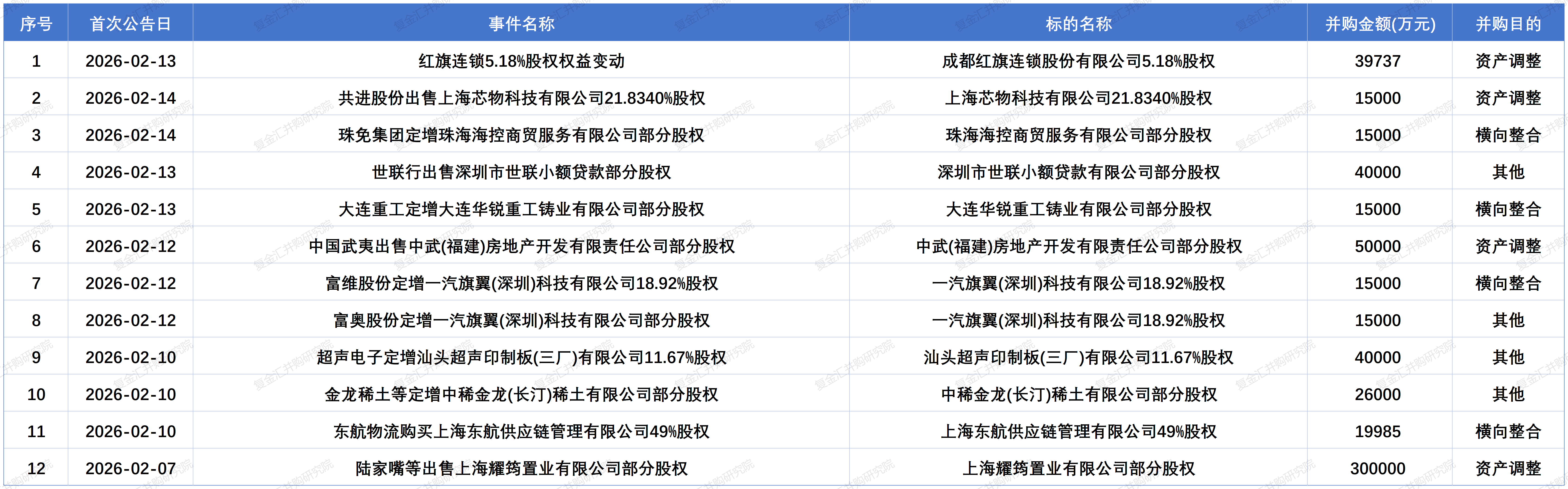 根据同花顺 iFinD 并购数据库,我们选取2026年2月7日至2026年2月20日期间首次公告的并购事件,梳理中国上市公司及国企并购市场的最新动态,以期为读者提供有价值的参考。
