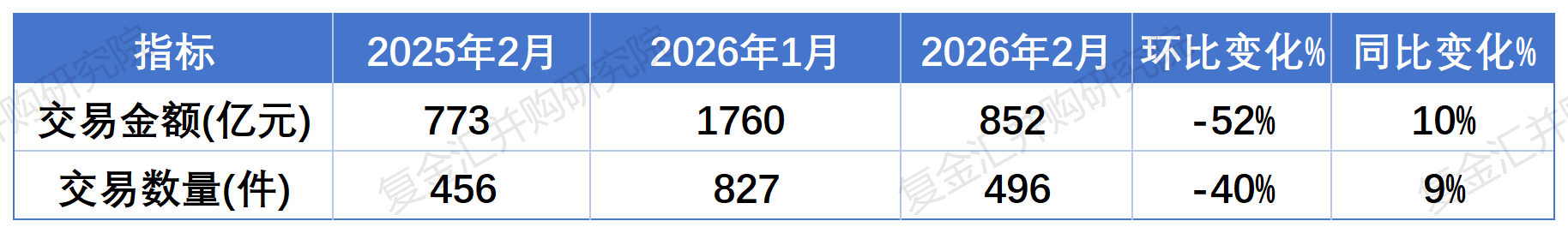 从并购市场交易规模来看,2026年2月,中国并购市场交易规模852亿元,同比上升10%,环比下降52%。