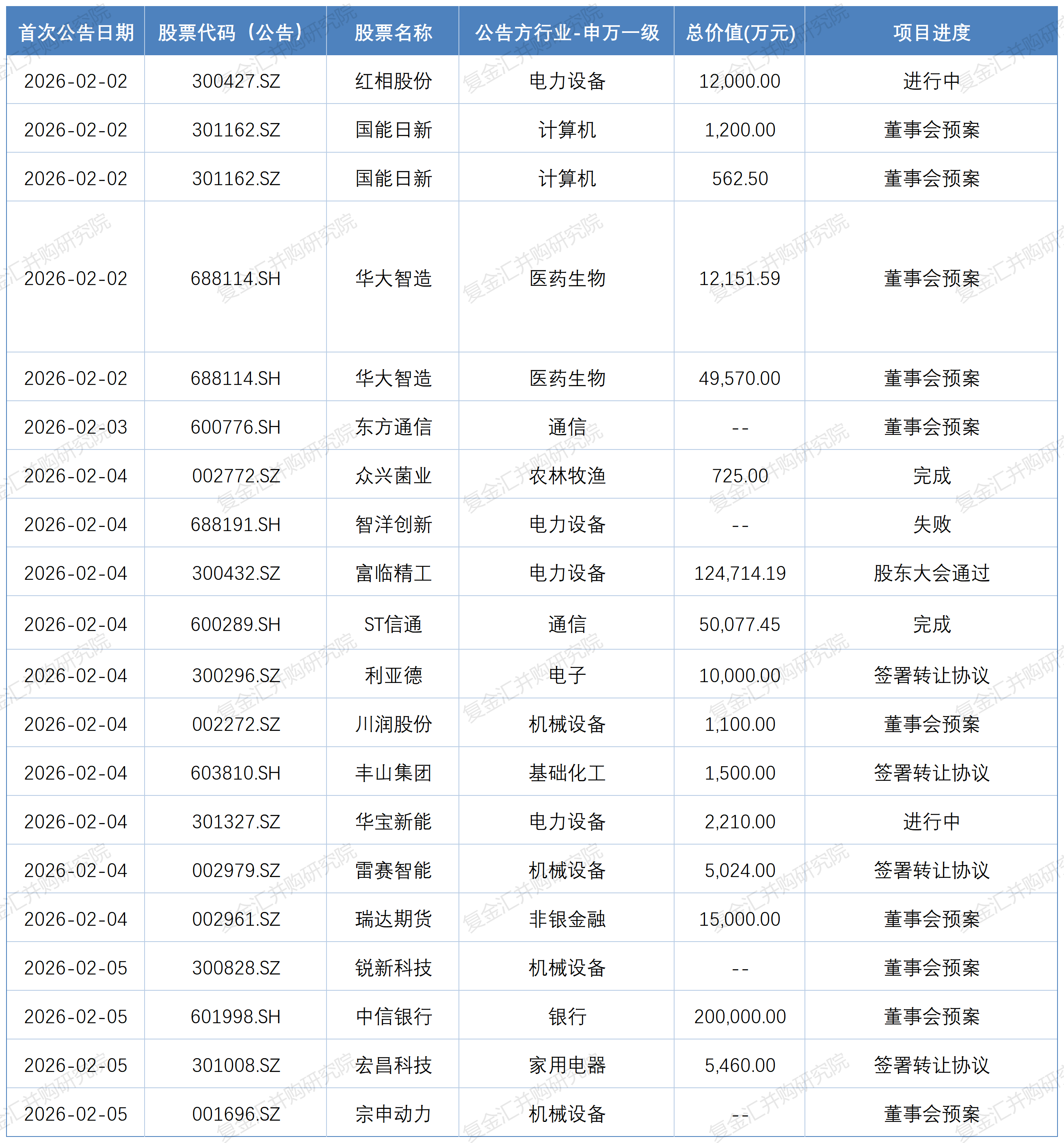 根据同花顺ifind数据库,我们选取首次公告日在2026年2月的上市公司并购重组事件,合计164起。审批进度及相关情况见下表(文章篇幅有限,仅展示部分内容):